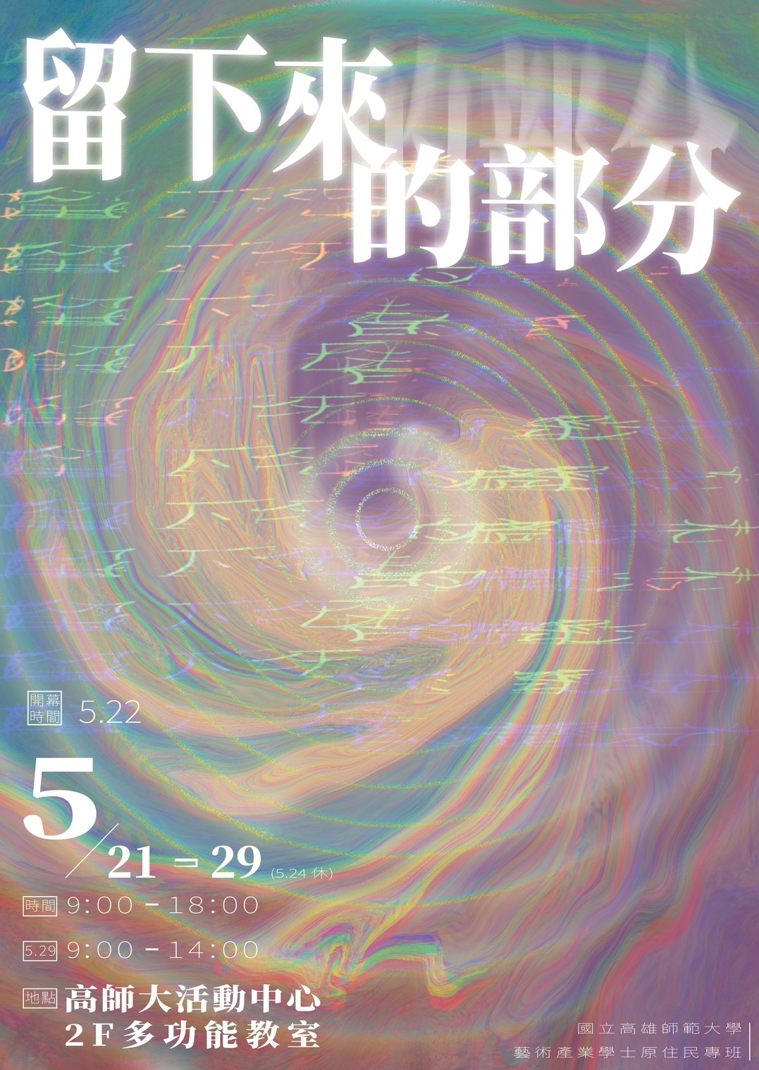 22 3 月 藝術產業學士原住民專班成果展 留下來的部分 Posted at 23:21h in 學院活動 by art 0 Comments 219 Likes Share 藝術產業學士原住民專班成果展「留下來的部分」時間:2026年05月21日~05月29日 5/24休展 / 05月29日 9:00~14:00其餘時間為9:00~18:00地點:高師大和平校區活動中心2樓多功能教室