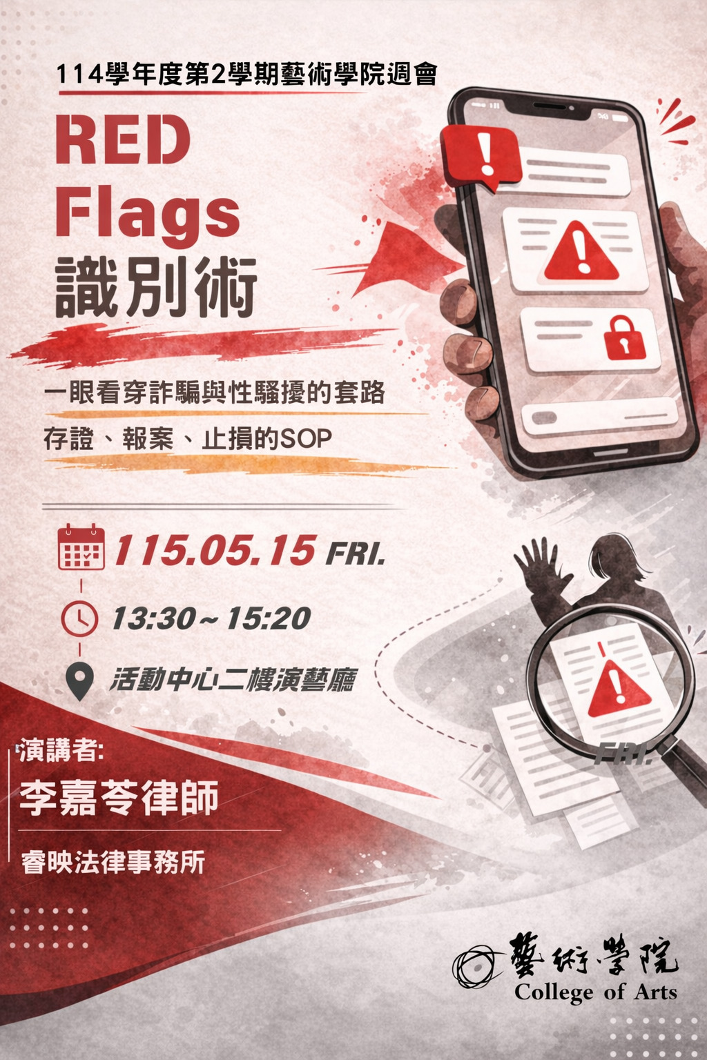 26 3 月 《Red Flags 識別術:一眼看穿詐騙與性騷擾的套路──存證、報案、止損的SOP》 Posted at 12:45h in 學院活動 by art 0 Comments 219 Likes Share 主旨:藝術學院辦理114學年度第2學期院週會說明:一、依據本校導師制實施辦法辦理。二、時間:115年5月15日(星期五)下午13時30分~15時20分。(一)13:30~13:40 集合點名。(二)13:40~13:50 頒獎。(三)13:50~14:00 院長致詞。(四)14:00~15:20 專題演講。三、地點:本校和平校區活動中心演藝廳。四、本次邀請睿映法律事務所李嘉苓主持律師擔任講座,講題為《Red Flags 識別術:一眼看穿詐騙與性騷擾的套路──存證、報案、止損的SOP》。五、參加對象:美術系、音樂系、視設系、藝產班大學部一至四年級同學。六、各班班代負責點名簽到作業,未出席者須依規定請假。七、114學年度第1學期大學部各班學業成績前三名同學,請務必出席受獎。