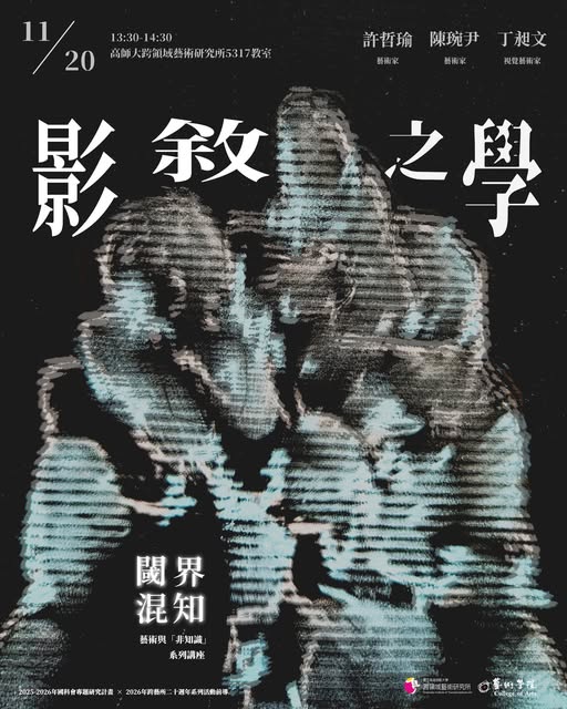 【活動宣傳】 「閾界混知:藝術與「非知識」系列講座」 #微型論壇五【影敘之學】 ・丁昶文|視覺藝術家 ・許哲瑜|藝術家 ・陳琬尹|藝術家 日期:11/20(四) 時間:13:30-14:30 地點:國立高雄師範大學 跨領域藝術研究所 5317教室...