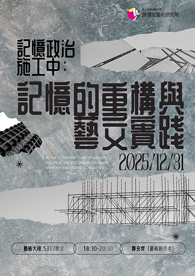 【專題講座】 記憶政治施工中:記憶的重構與藝文實踐 講者|鄭安齊(藝術創作者) 時間|2025/12/31(三) PM18:30-20:30 地點|藝術大樓 跨藝所 5317教室 ...