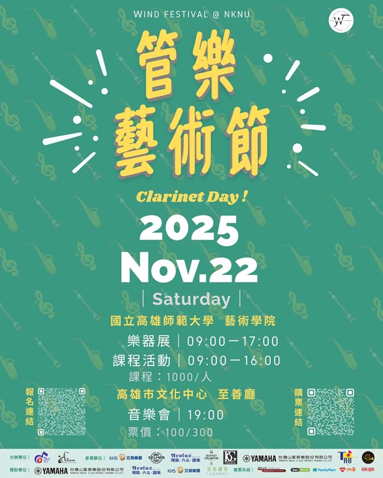 活動名稱:高師大管樂藝術節 - 「Clarinet Day!」單簧管日音樂會 活動時間:2025/11/22(六) 活動地點:國立高雄師範大學藝術學院教室(講座)、高雄市文化中心至善廳(音樂會)...