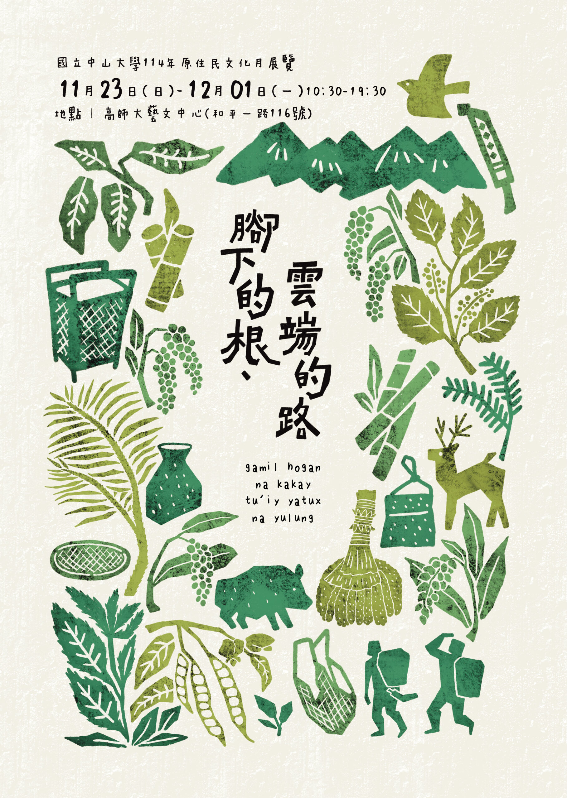國立中山大學 114年原住民文化月展覽-「腳下的根、雲端的路」 (gamil hogan na kakay tu'iy yatux na yulung) 時間:2025年11月23日(日)– 2025年12月1日(一)10:30 – 19:30 地點:國立高雄師範大學藝文中心(苓雅區和平一路116號) 開幕座談: 2025年11月23日(日)14:00 – 16:30 ...