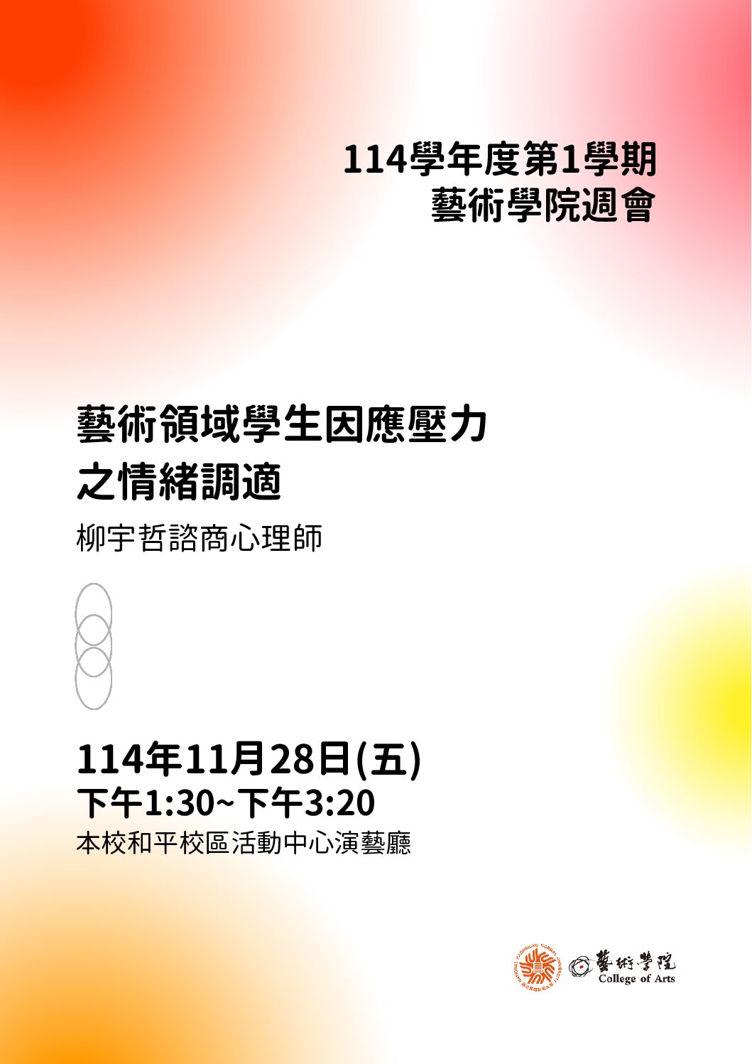 藝術領域學生因應壓力之情緒調適 本校和平校區活動中心演藝廳 日期|114年11月28日(週五) 下午1:30~下午3:20...